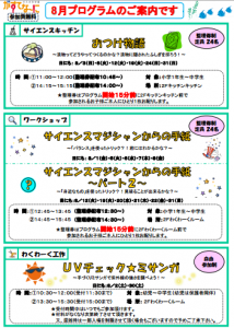 8月は、「サイエンス アドベンチャー」や「がすてなーにの自由研究」などのイベントの他、親子で楽しめるワークショップも開催します!