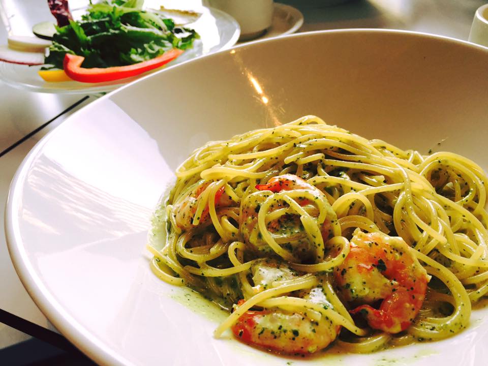 ▲小エビはぷりぷり♪ ジェノベーゼクリームソースもたまらないおいしさ♪