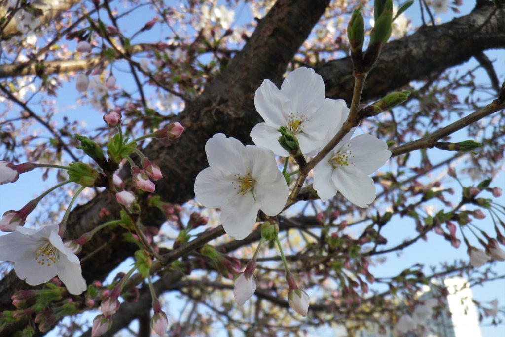 最近は気温も暖かくなりましたね。豊洲公園の桜はすでに満開を迎えたようですが、豊洲まちなみ公園の桜はようやく開花し始めた様子。